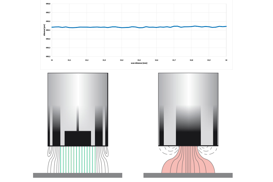 Capacitive sensors are based on the detection of a change in capacitance. With a plate-type capacitor, the capacitance between two plates of constant size can be changed by altering their distance or by placing a dielectric in the measuring gap. The sensor (measurement electrode) and the conductive measuring object act like an ideal plate-type capacitor. If an alternating current of constant frequency flows through the sensor capacitor, the amplitude of the alternating voltage on the sensor is proportional to the distance to the target (ground electrode). To ensure consistent measurements, the dielectric constant between the sensor and the object being measured must remain constant.
