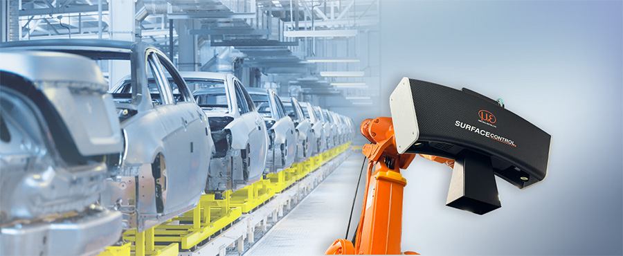 Mit surfaceCONTROL Automotive steht in der Automobilindustrie ein roboterbasiertes Messsystem zur vollautomatisierten Defekterkennung auf Roh-Karosserien zur Verfügung. Die Erfassung der diffus reflektierenden Oberflächen erfolgt über 3D-Sensoren, die das Prinzip der Streifenlichtprojektion nutzen. Lokale Formfehler – zum Beispiel Dellen, Beulen, Kerben oder Kratzer – können mittels eines lernenden Verfahrens mit hoher Präzision und Reproduzierbarkeit erkannt werden.